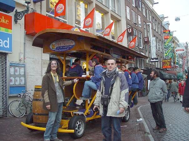 翌日はアムステルダムを見て回った。ライツェ広場では、地下が牢屋になっているブルドッグ店でコーヒーを飲んだ。バーガーショップの前ではバイク・カフェという移動式バーに遭遇。学生たちがやってきてはビールを空にしていた。つぎつぎに場所を移動していくが、エンジンはバーにいる人達で燃料がビールというわけ。私たちもカナビスを補給しにスプイ広場近くのダンプクリングに行くところだった。