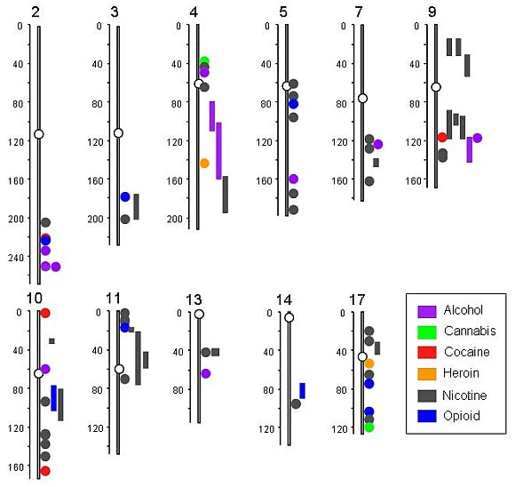 リー教授は、「複数ドラッグ中毒のピーク時に特定の染色体のゲノム配置を比較することで、それぞれのドラッグに対する遺伝的な脆弱性を確定することができます。配置は、オーバーラップしていたりある部分が重なったりしています」 と言う。彼はさらに、アルデヒド・デヒドロゲナーゼ、GABRA2、ANKK1、ニューレキシン1および3などの数種の遺伝子が多重ドラッグ中毒と関連していることがすでに示されていると指摘している。