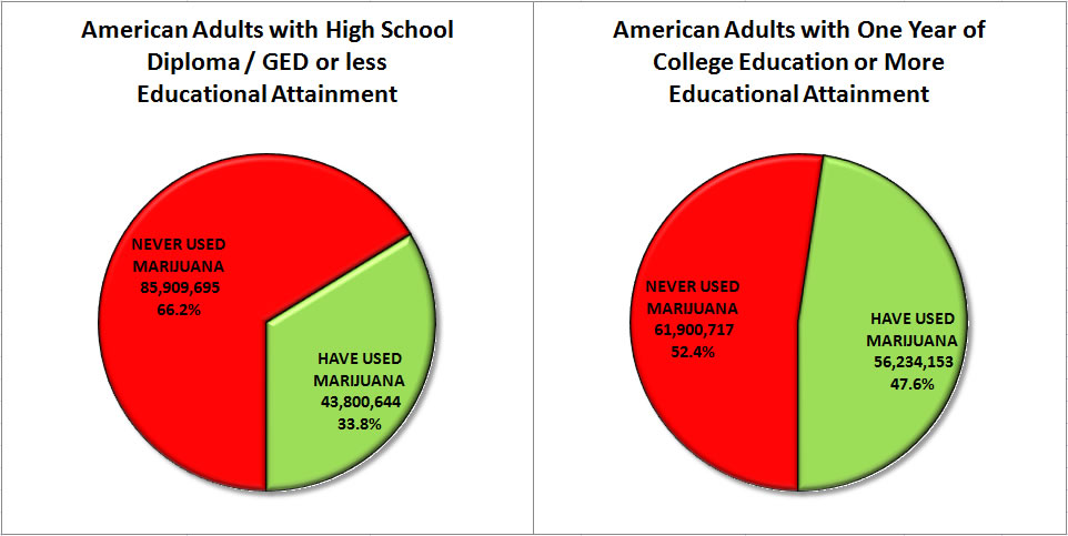 いい質問。SAMHDAの2007年ドラッグ使用と健康に関する全国調査をベースにした クイック・テーブル によれば、カナビス・スモーカーは、使ったことのない人に比較して教育程度が高く、よりハードに働くことが示されている。