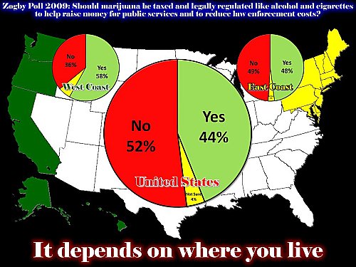 実際、全国平均ではなく地域を限定してみると、カナビスの合法化支持が過半数を越えているところもある。今年2月に実施されたゾグビーの調査 では、全国平均では、賛成44%、反対52%で今回の調査とほぼ同じになっているが、アメリカ西海岸地区に限定すると58%がカナビスをアルコールと同様に規制して販売することに賛成している。クリックで拡大